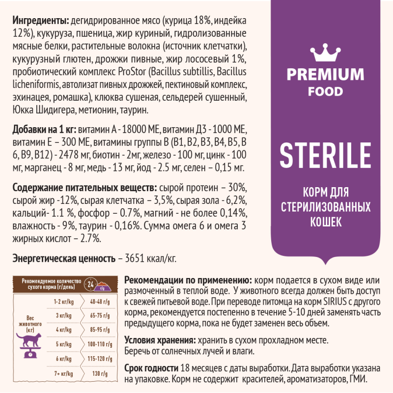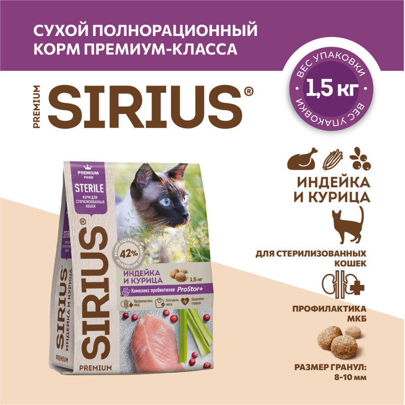 SIRIUS сухой корм для стерилизованных кошек 1,5кг индейка и курица