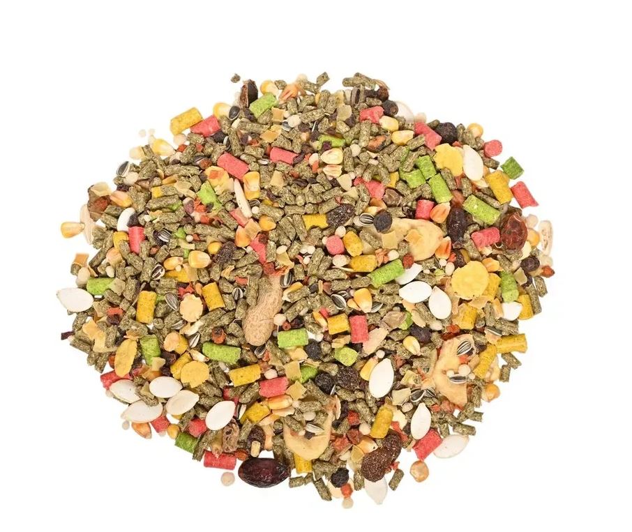плоды рожкового дерева, кукурузная мука, пшеничная мука, гороховые хлопья, картофель, травяная гранула, изюм, кукуруза, воздушная пшеница, воздушный рис, арахис, плоды боярышника, плоды шиповника, семена подсолнечника, банан, рябина, кукурузные хлопья, семена тыквы, яблоко, свекла, морковь, лесной орех