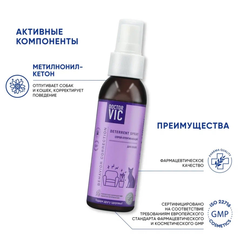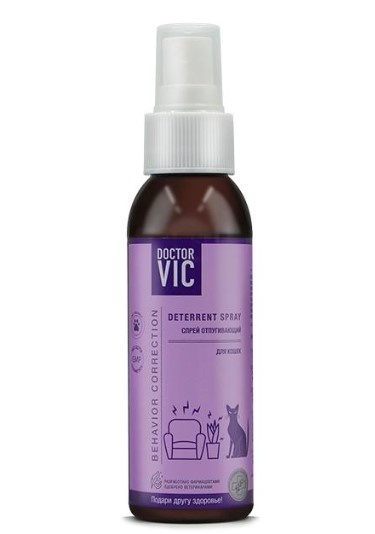 "Спрей Doctor VIC отпугивающий - это средство для коррекции поведения кошек. Оно защищает предметы интерьера, комнатные растения, а также поверхности от порчи и использования их в качестве туалета. Помимо всего прочего, средство дезинфицирует место обработки.