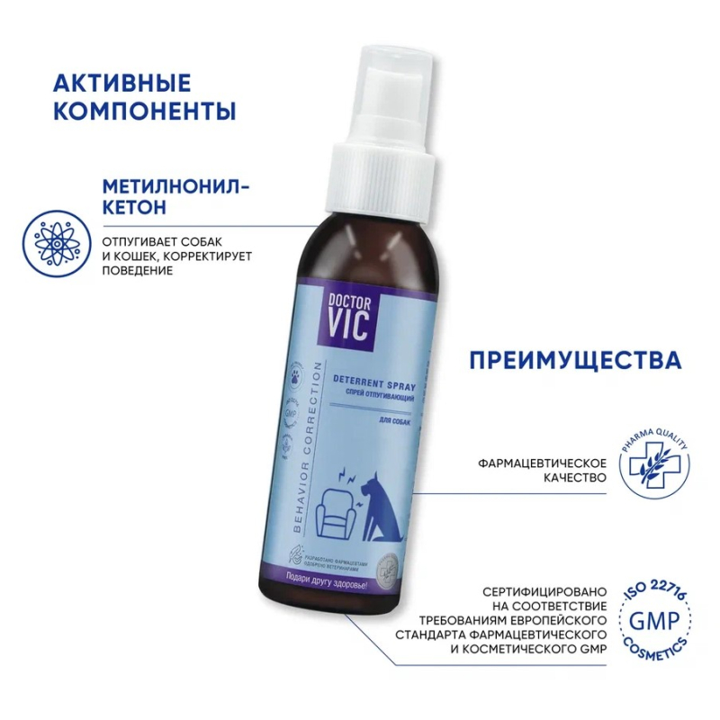"Спрей Doctor VIC отпугивающий - это средство для коррекции поведения собак. Оно помогает в приучении питомца держаться на расстоянии от мест, где его пребывание нежелательно. Помимо этого спрей дезинфицирует место обработки.