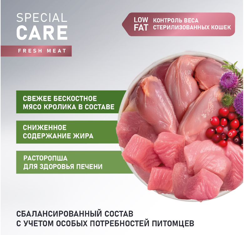 "Сбалансированный полнорационный сухой корм со свежим мясом кролика с добавлением расторопши и клюквы -это функциональное питание для стерилизованных кошек, которое поддерживает идеальный вес питомца благодаря сниженному содержанию жира и источникам биологически активных веществ в составе, обеспечивая комплексную заботу о здоровье вашего питомца на долгие годы. Свежее бескостное мясо в составе обладает высокой вкусовой привлекательностью и является ценным источником легкоусвояемого животного белка.