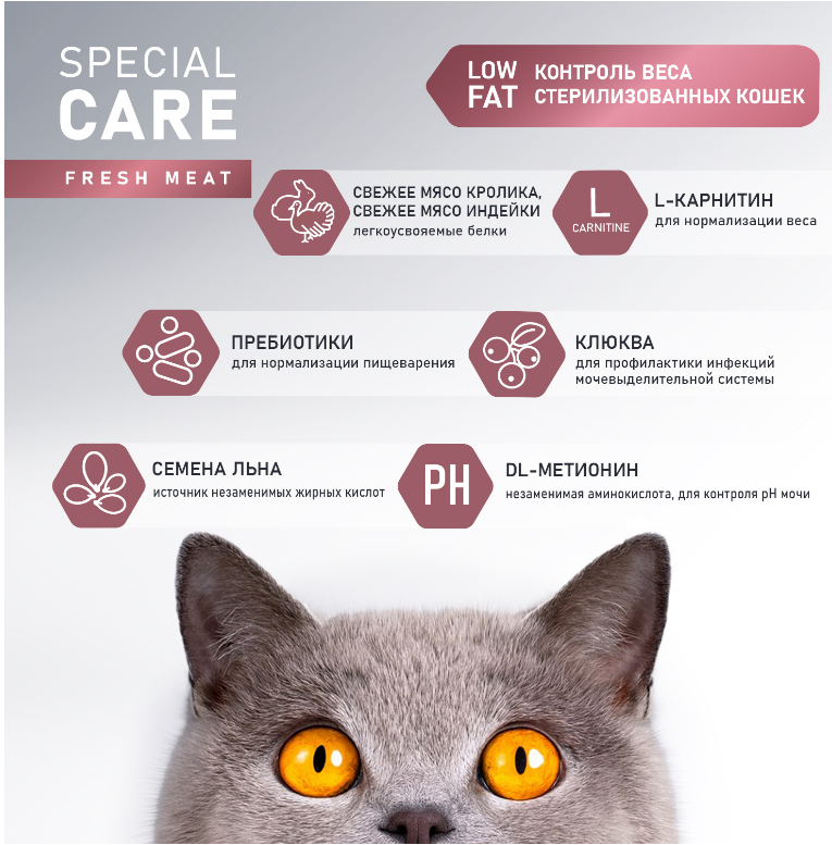 Сбалансированный состав, высокое содержание мясных ингредиентов необходимых для сохранения мышечной массы и энергии питомца. L-карнитин позволяет контролировать массу тела.