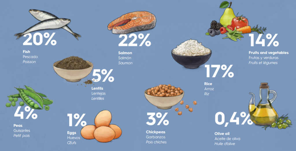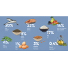 Состав: обезвоженный лосось (23%), обезвоженная жирная рыба (20%), рис (17%), масло лосося, сушеное яблоко (5%), картофель (5%), чечевица (5%), фрукты и овощи (4%) (сушеная груша, свекольный жом, сушеная морковь, сушеный помидор, красные фрукты, цитрусовые), горох (4%), нут (3%), подсолнечное масло, льняное масло, обезвоженное яйцо (1%), сухие пивные дрожжи, хлорид калия, экстракт криля + PROVITAL FORMULA (2%): оливковое масло (0,40%), зеленые мидии , гидролизованные ракообразные (природный источник глюкозамина), гидролизованные хрящи (природный источник хондроитина), обезвоженный шпинат, сушеные лепестки бархатцев (природный источник лютеина), обезвоженные люцерна, дегидратированные морские водоросли (спирулина), дегидратированная брокколи, экстракт одуванчика, экстракт листьев мяты, экстракт семян зеленого чая, сушеная ромашка, экстракт цитрусовых, экстракт винограда, масло огуречника, экстракт красных плодов, экстракт чеснока, экстракт тимьяна, экстракт орегано, экстракт семян расторопши, экстракт юкки, экстракт розмарина, экстракт алоэ вера, клюквы, ФОС, МОС.