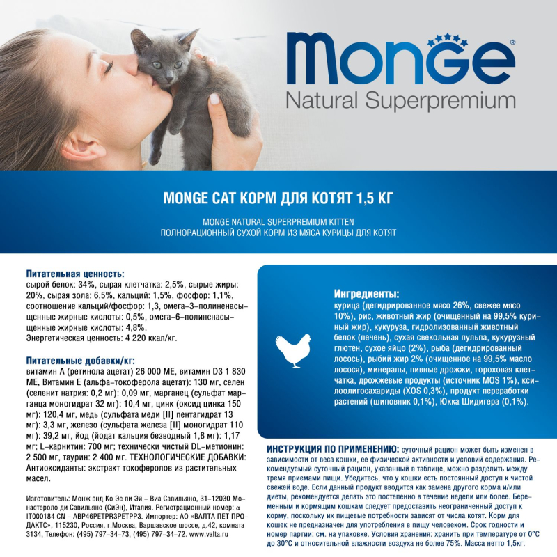 "Monge (Монж) Cat Daily Line сухой корм из мяса курицы для котят 1,5 кг.