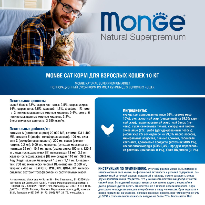 "Monge (Монж) Cat Daily Line сухой корм из мяса курицы для взрослых кошек и котов 10 кг.