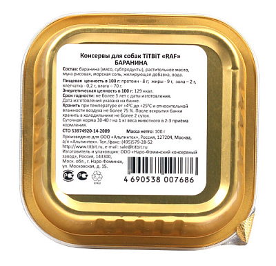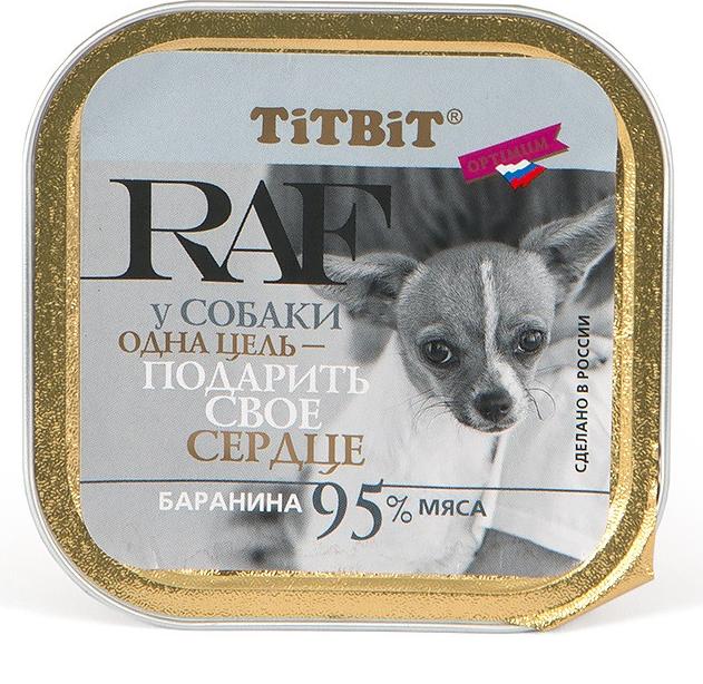TiTBiT Консервы для собак RAF (баранина) - дополнительный корм, представляющий собой нежный паштет, состоящий из высококачественного мясного сырья (мясо, качественные субпродукты).
