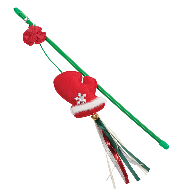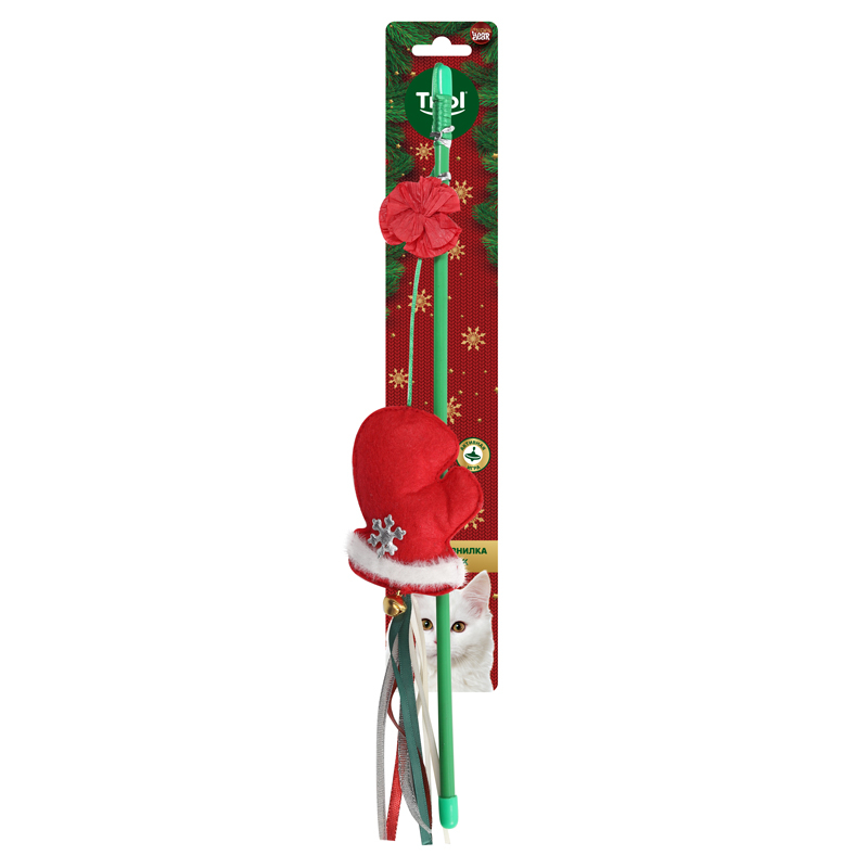 Яркая и функциональная удочка-дразнилка - это всегда актуальный аксессуар для усатых-полосатых. Такая удочка и развлекает питомца, и дрессирует одновременно, помогая кошке также держать мышцы в тонусе, развивать сообразительность и реакцию. Изделие имеет прочную основу и декорирована оригинальными элементами в новогодней стилистике. Подвижная игрушка на шелковистом шнуре с мелодичным бубенчиком и яркими ленточками привлечет даже самых пассивных кошечек, вовлекая их в процесс веселой охоты.
