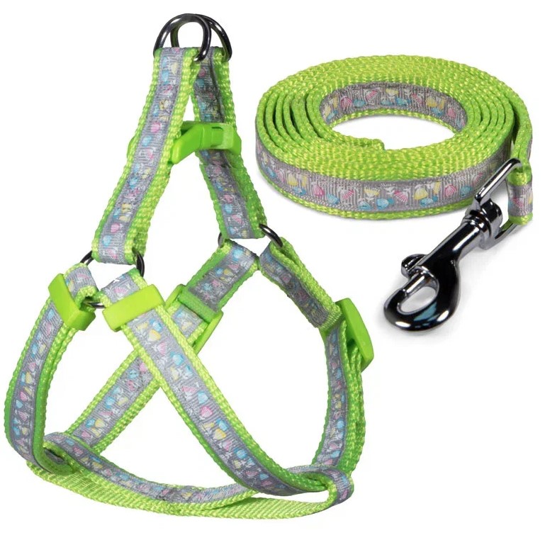 Яркий и функциональный комплект с аппликацией на шелковистой поверхности состоит из шлейки и поводка, выполненных в единой стилистике. Комплект изготовлен из высококачественного нейлона с использованием крепкой металлической и пластиковой фурнитуры. Регулируемая шлейка Y-образной формы с надежной пряжкой обеспечивает комфортную фиксацию изделия на теле животного без причинения дискомфорта даже при постоянной носке. Цвет: салатово-серый. Размеры изделия: шлейка 12*260-370мм; поводок 12*1200мм.
