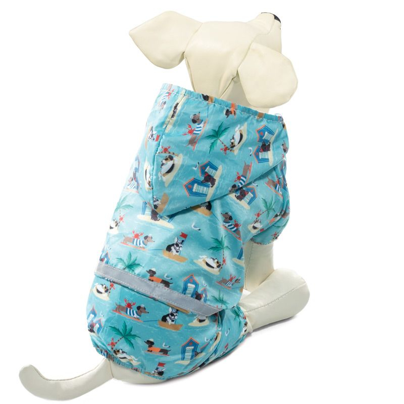 Особенностью дождевика является светоотражающая лента, идущая по талии изделия, - для повышения безопасности животного на дороге. Дождевик также имеет капюшон и фиксируется при помощи трех заклепок на животе, а на штанинах предусмотрены удобные резинки, препятствующие попаданию грязи и влаги снизу.