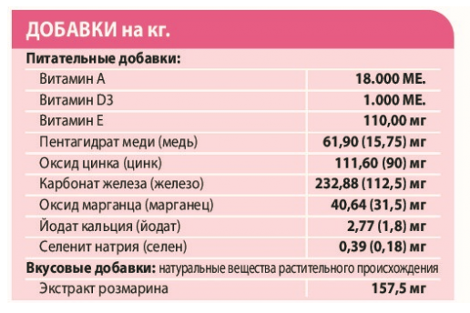 Состав: дегидратированный животный белок (29%, из них ветчина сырая 10,5%*), рис (14%), картофель (11%), кукуруза, кукурузные зёрна, куриный жир, жом свекольный сушеный, мясо свинины свежее (4%), гидролизированные животные белки, помидоры (1%), жмых семян тыквы (0,5%), глюкозамин. * что сооотвествует 30% регидратированной ветчины.