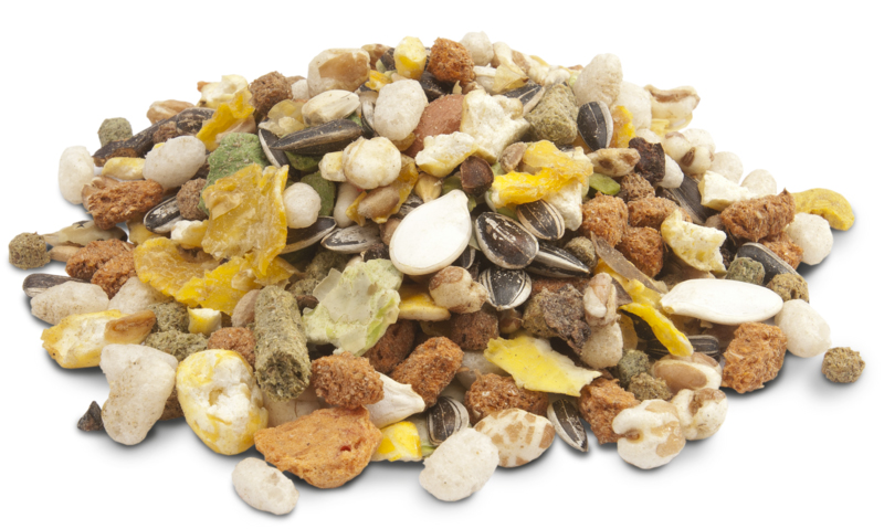 Состав: злаки (40%), семена, производные растительного происхождения, овощи, орехи, фрукты, экстракты растительных белков, минеральные вещества, масла и жиры, сахара.