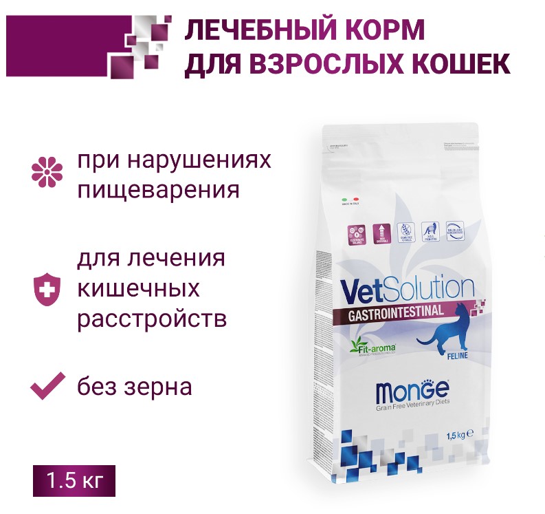 Лечебный корм Monge (Монж) VetSolution Cat Gastrointestinal Гастро интестинал для кошек при заболеваниях желудочно-кишечного тракта, таких как гастрит, колит, острый и хронический гастроэнтерит, диарея и избыточный бактериальный рост в тонком отделе кишечника 1,5 кг.