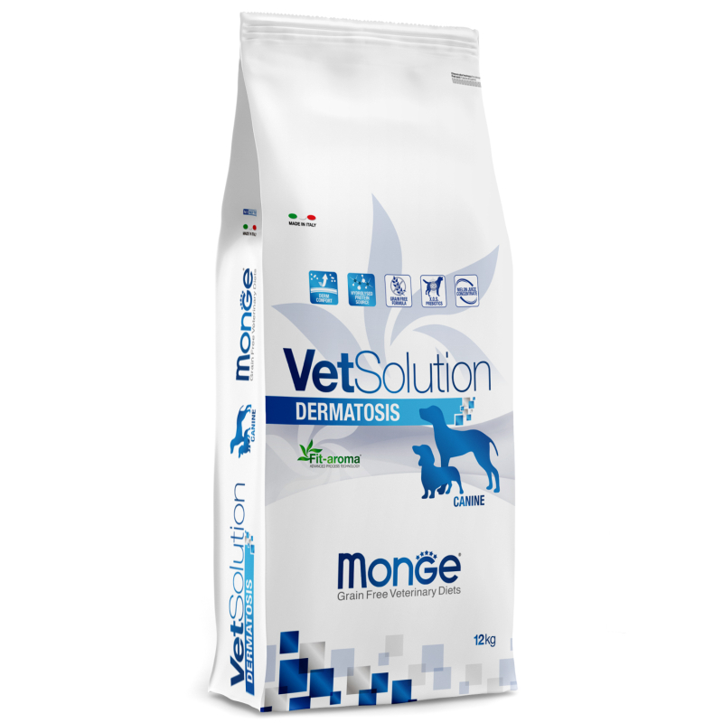 Лечебный корм Monge (Монж) VetSolution Dog Dermatosis Дерматозис для собак при заболеваниях кожи, таких как дерматит, хронический зуд, заболеваниях кожи, сопровождающиеся воспалением, пищевая аллергия и пищевая непереносимость 12 кг.