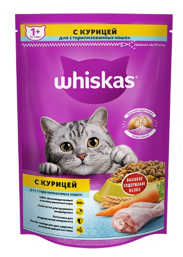 Whiskas для стерилизованных кошек (Курица) — это полнорационный сухой корм для взрослых стерилизованных котов и кошек. В Whiskas в правильных пропорциях собраны все необходимые витамины и минералы, белки, жиры и углеводы, чтобы поддерживать здоровье вашей любимицы от усов до кончика хвоста.