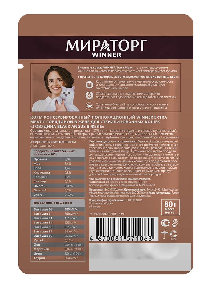 Мираторг Extra Meat для стерилизованных кошек (говядина Black Angus в желе) - полнорационный влажный корм для стерилизованных кошек с говядиной Black Angus в желе.