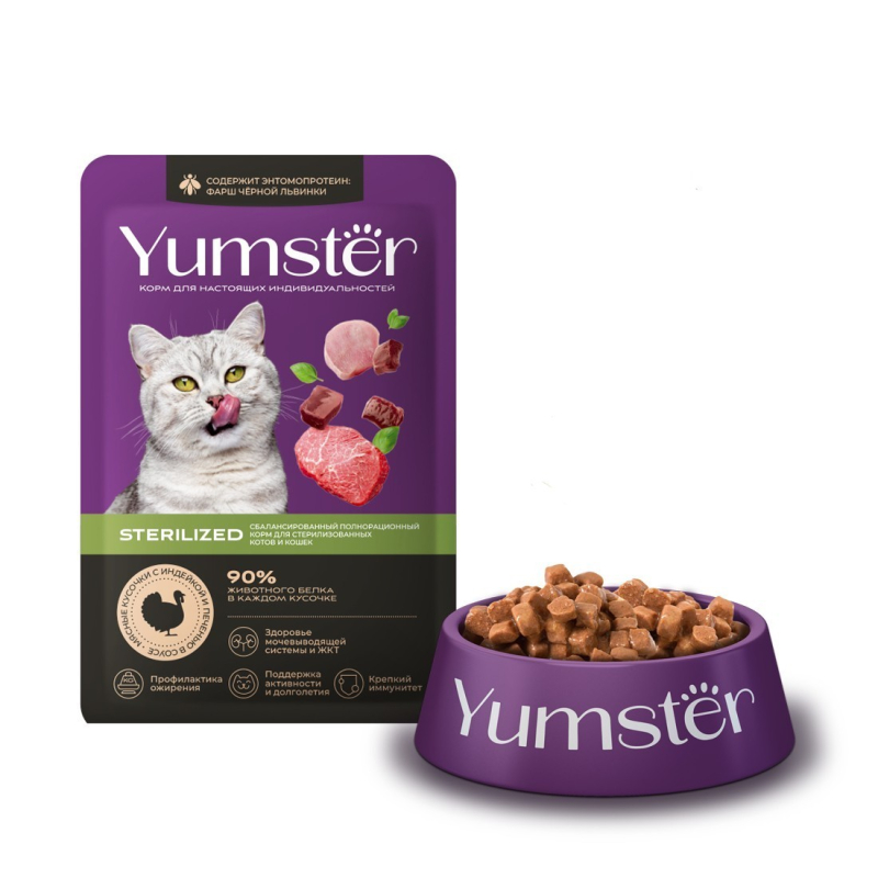 Стерилизованные кошки требуют особого питания, поддерживающего здоровье и красоту. Рецепты Yumster созданы с любовью экспертами по питанию животных – для удовольствия и долголетия Вашей кошки. Диетическое мясо индейки и ароматная печень во вкуснейшем соусе – полезное наслаждение! Корм содержит фарш из свежей чёрной львинки. Это естественная и желанная пища пушистого хищника, источник множества полезных аминокислот и микроэлементов. Ямстер – богатство выбора и натуральная польза для Вашего питомца!