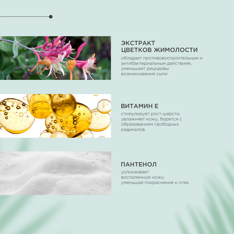 Экстракт цветков жимолости: обладает противовоспалительным и антибактериальным действием, уменьшает рецидивы возникновения сыпи